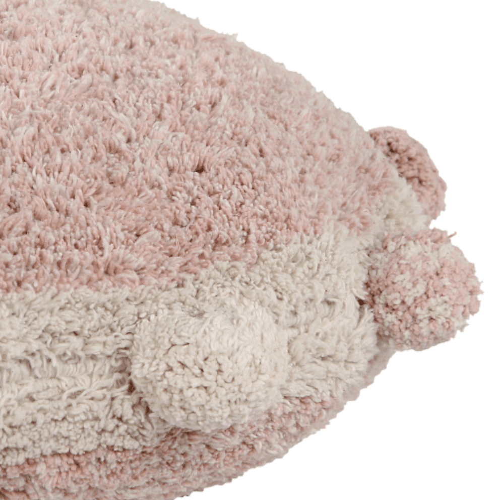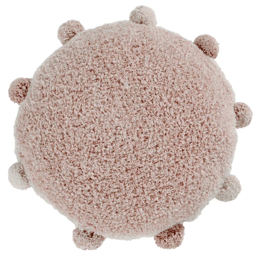 Almofada redonda e macia nas cores Natural e Nude, com pompons de algodão na borda.