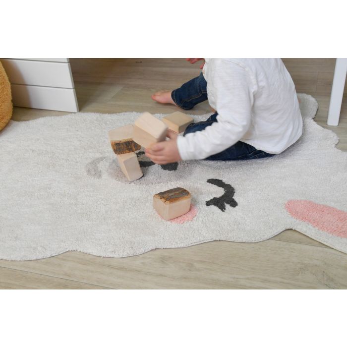• Tapete infantil em forma de rosto de coelho branco com detalhes pretos e rosa, criança sentada a brincar com blocos de madeira.