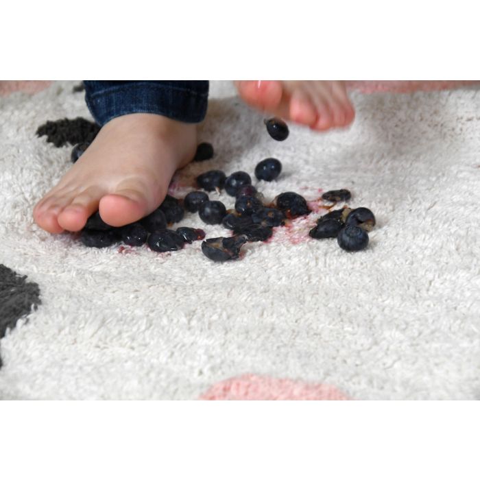 • Pés infantis esmagando uvas escuras num tapete felpudo branco com detalhes cinza e rosa.
