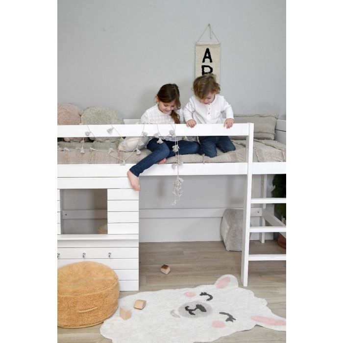 • Cama alta branca com crianças sentadas, tapete branco com rosto de animal e almofada castanha