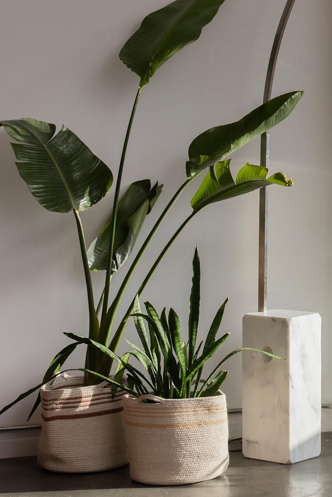 • Duas plantas em vasos de tecido bege com detalhes castanhos e suporte de mármore branco ao fundo