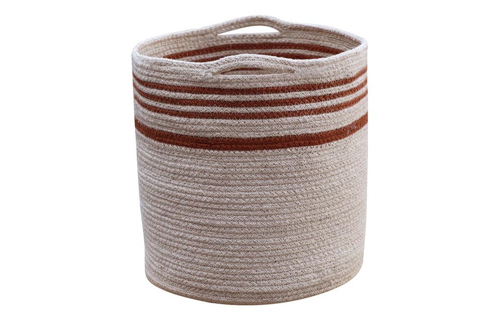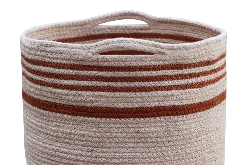• Cesto tecido redondo bege e castanho com riscas e pegas