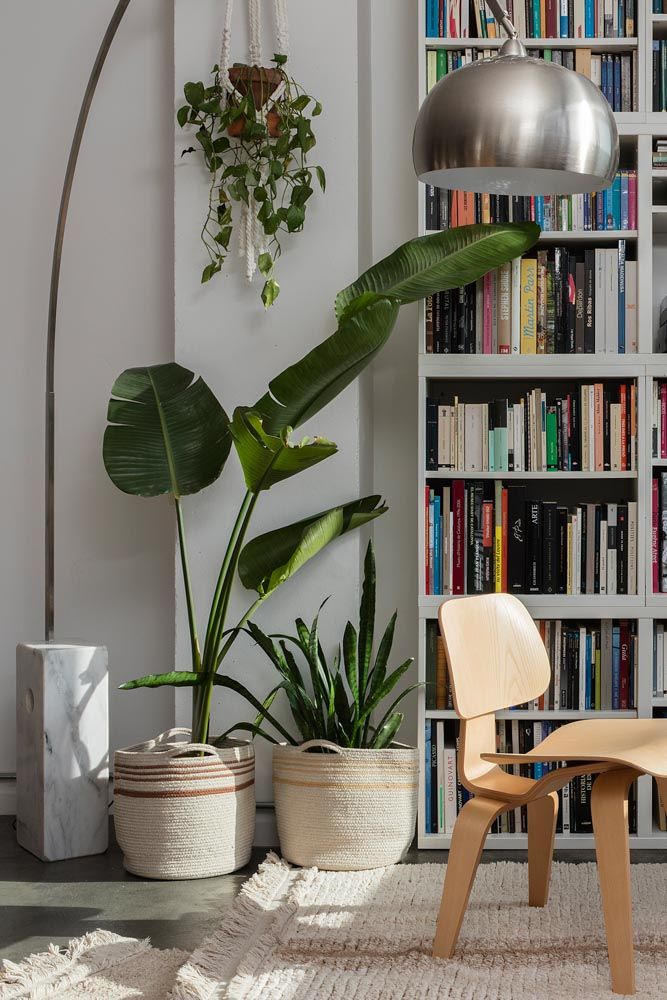 • Plantas em vasos naturais, cadeira de madeira, lâmpada metálica e estante de livros