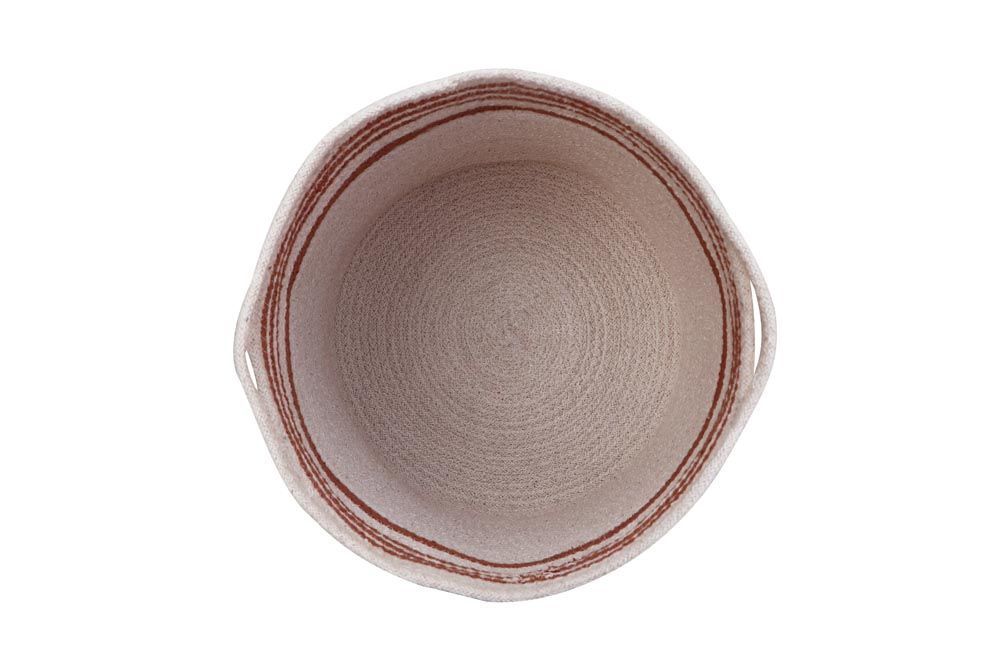 • Cesto redondo de tecido bege com padrão de linhas em vermelho no interior