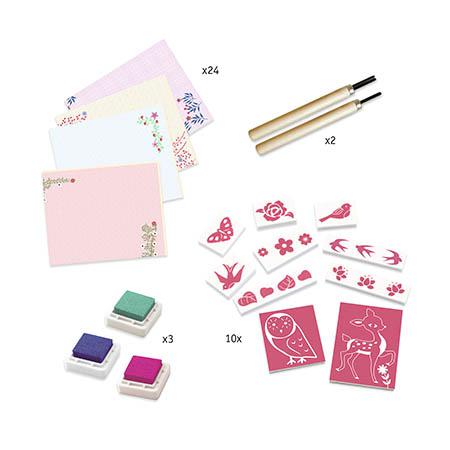 Caixa do produto Djeco Tampons à graver com desenho de cervo, borboleta, pássaro e carimbos coloridos.