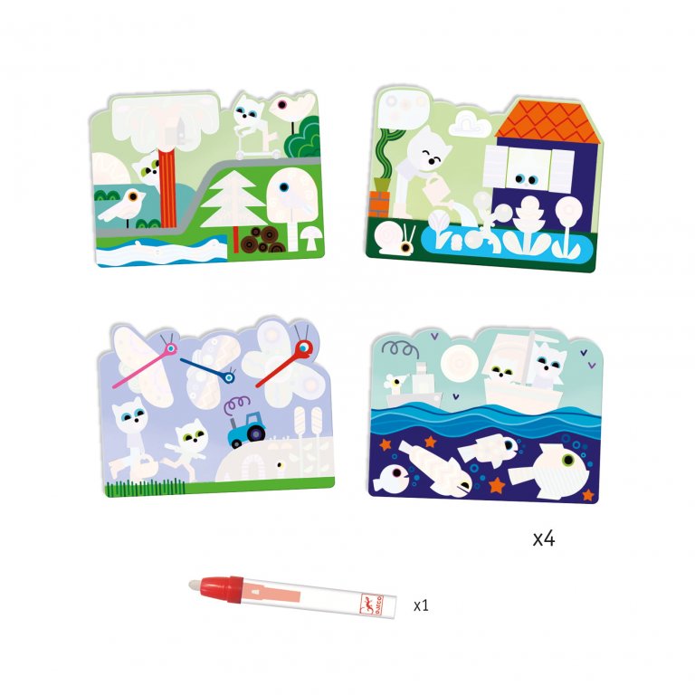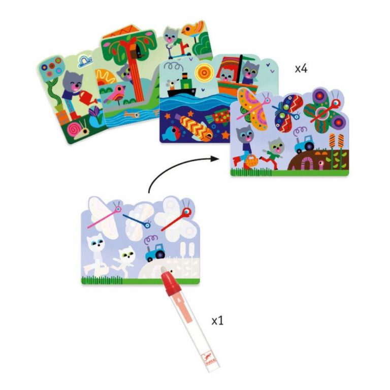 • Produto para crianças com gato a regar plantas, casa colorida e texto em várias línguas indicando coloração mágica.
