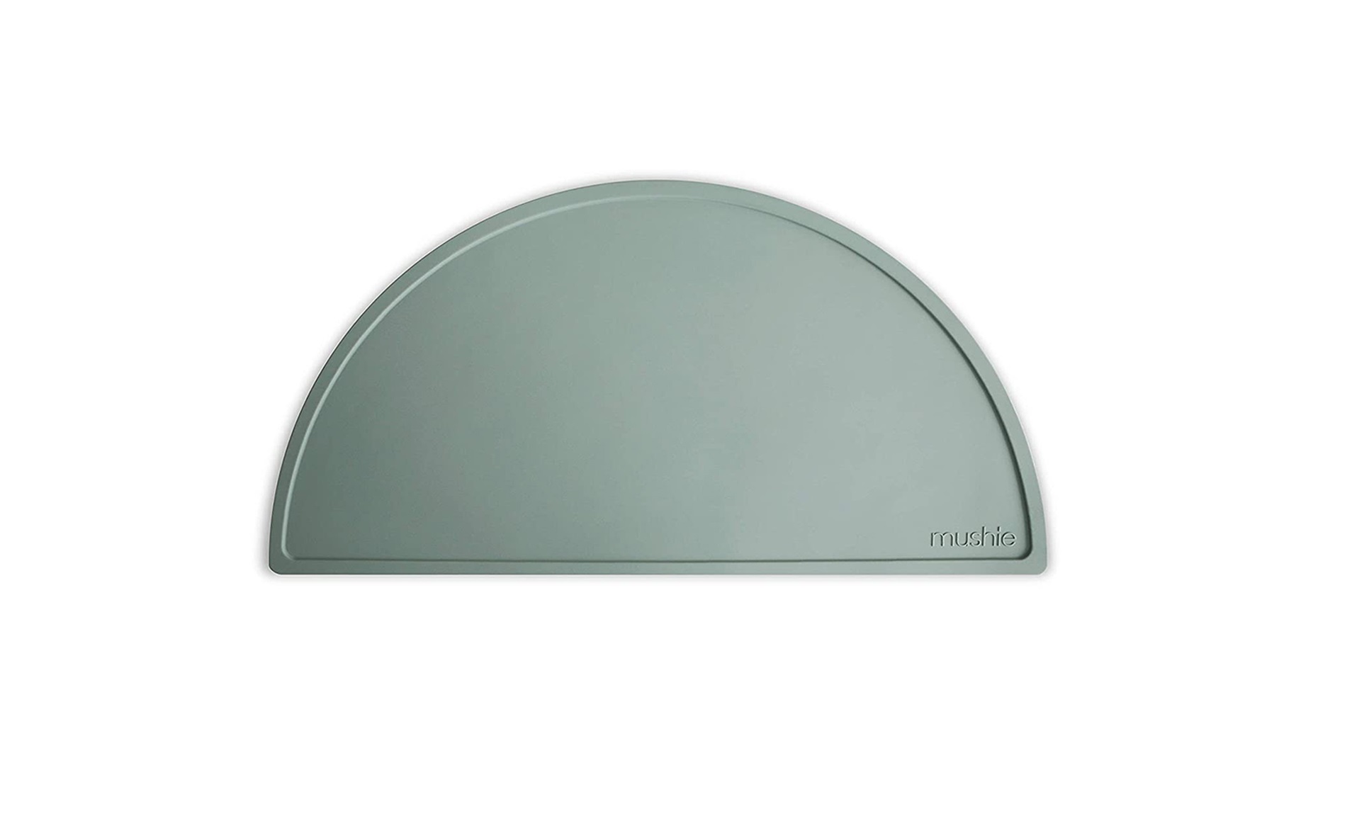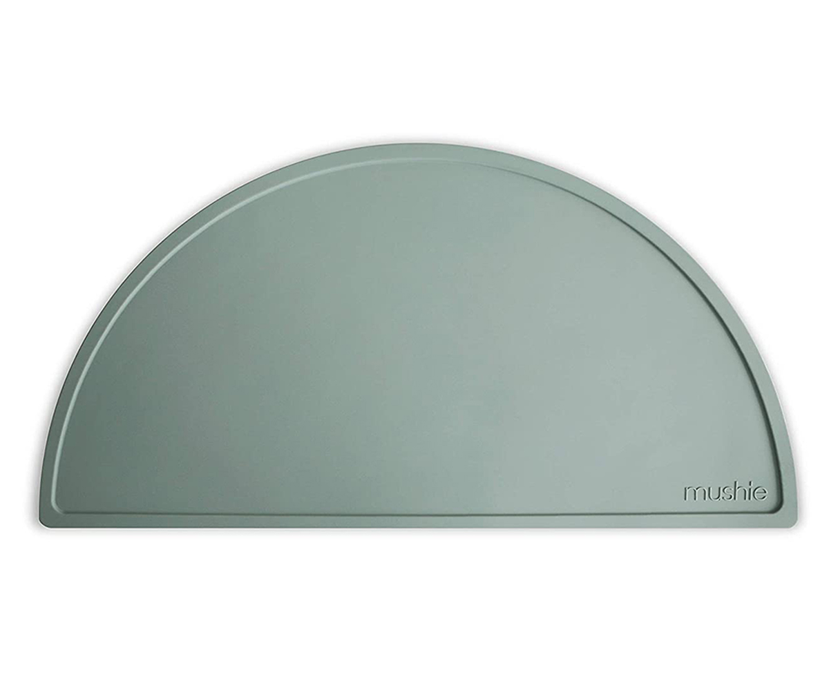 • Tapete de silicone semicircular verde-acinzentado com marca mushie