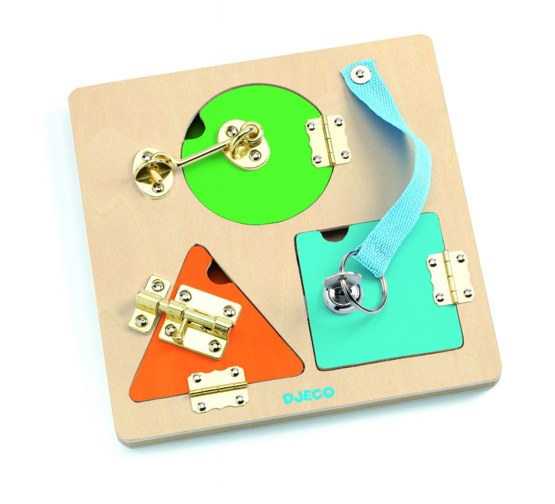 Esta fechadura básica de madeira colorida inclui três fechaduras diferentes em três portas.