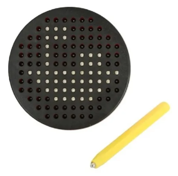 • Jogo de quebra-cabeças magnético circular preto com bolas metálicas e caneta amarela em fundo branco