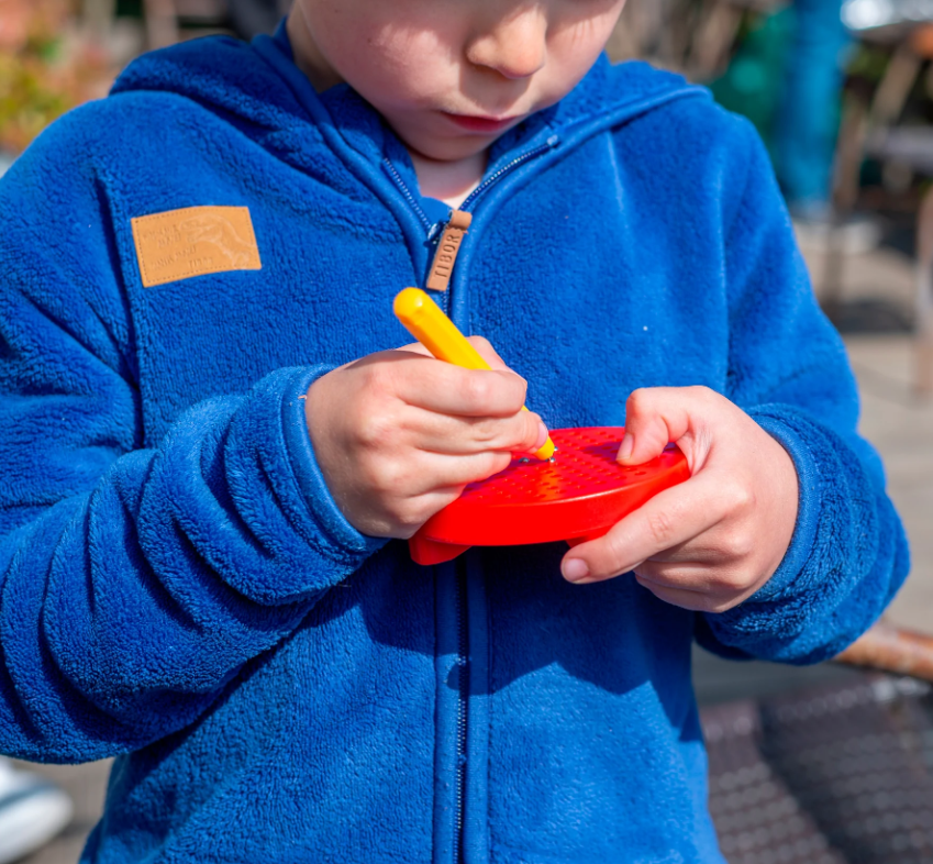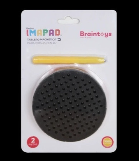 • Tabuleiro magnético preto circular com lápis amarelo em embalagem branca com texto colorido
