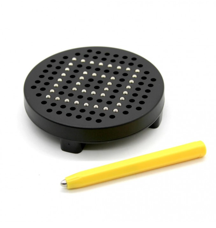 Quadro de bolso circular composto por pequenas bolas magnéticas que sobem à superfície graças ao poder do lápis magnético que permite formar figuras e desenhos 2D.